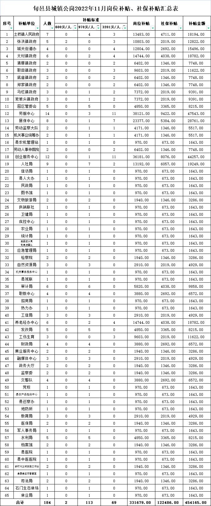 附:1、旬邑县城镇公岗2022年11月岗位补贴、社保补贴汇总表