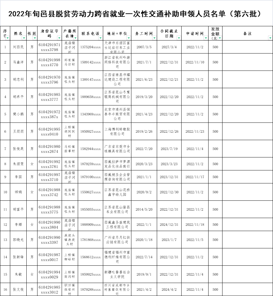 按照旬邑县财政局 旬邑县乡村振兴局 旬邑县人力资源和社会保障局关于印发《旬邑县跨省(县)就业一次性交通补助实施细则》的通知(旬人社发[2022]177号),经过个人申请、村级申报、镇办初审、部门复审等程序,确定任成程等16名脱贫劳动力申领跨省就业一次性交通补助,现将申领人员名单予以公示。