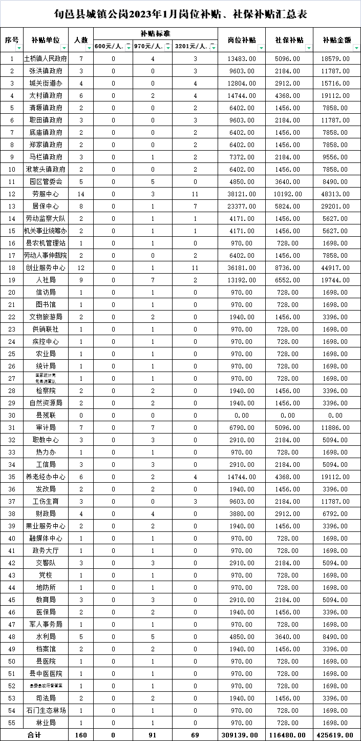 附:1、旬邑县2023年1月公益岗人员岗位补贴、社保补贴发放汇总表