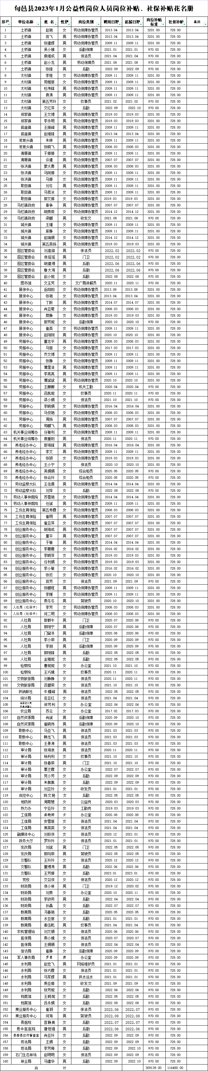 2、旬邑县2023年1月160名公益岗人员岗位补贴、社保补贴发放花名册