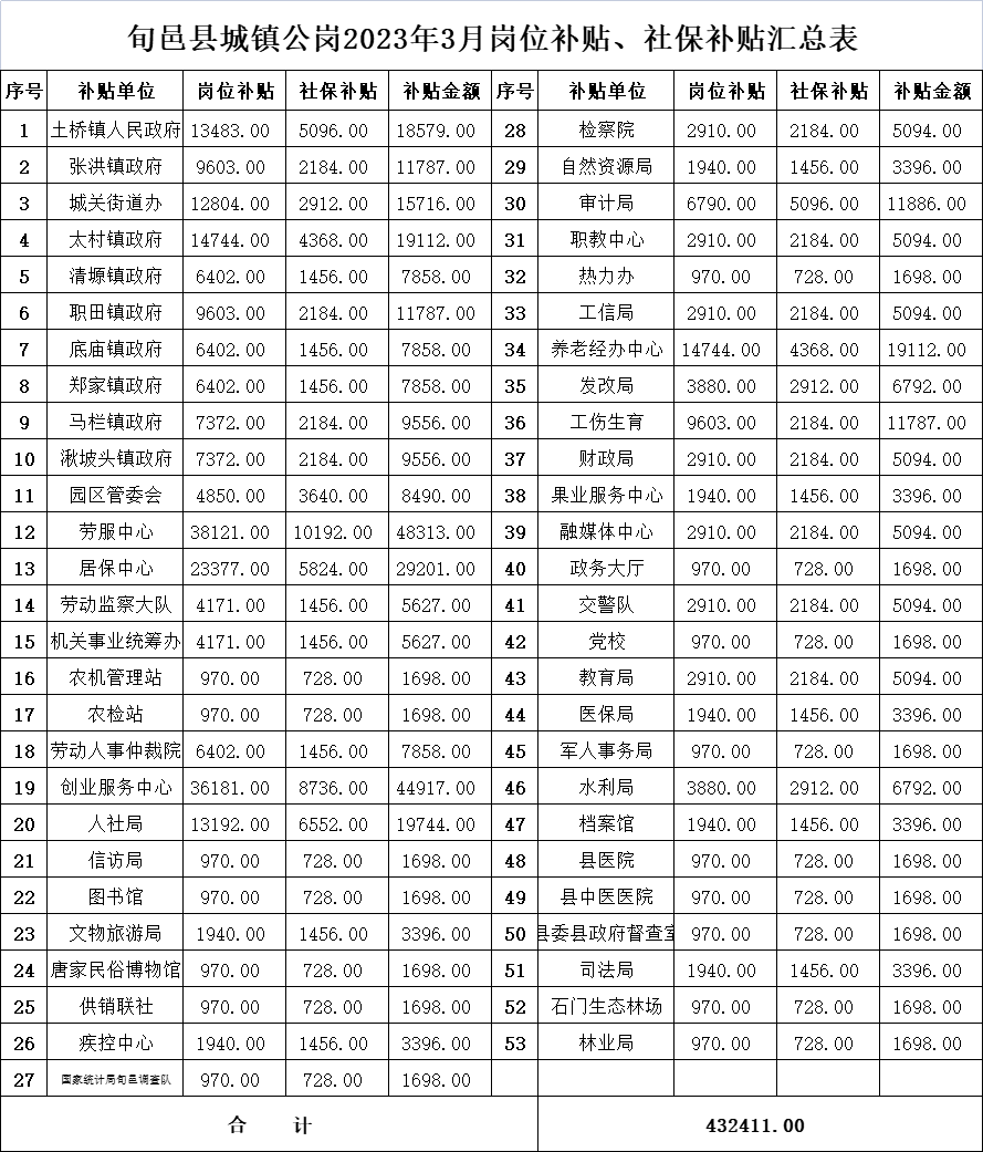 附:1、旬邑县2023年3月公益岗人员岗位补贴、社保补贴发放汇总表