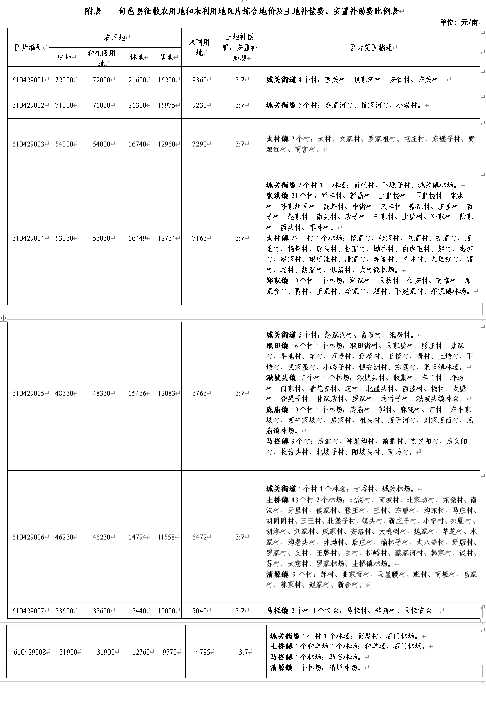 附件:旬邑县征收农用地和未利用地区片综合地价及土地补偿费、安置补助费比例表