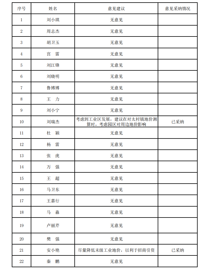 旬邑县2021年度城镇基准地价更新听证会意见统计表
