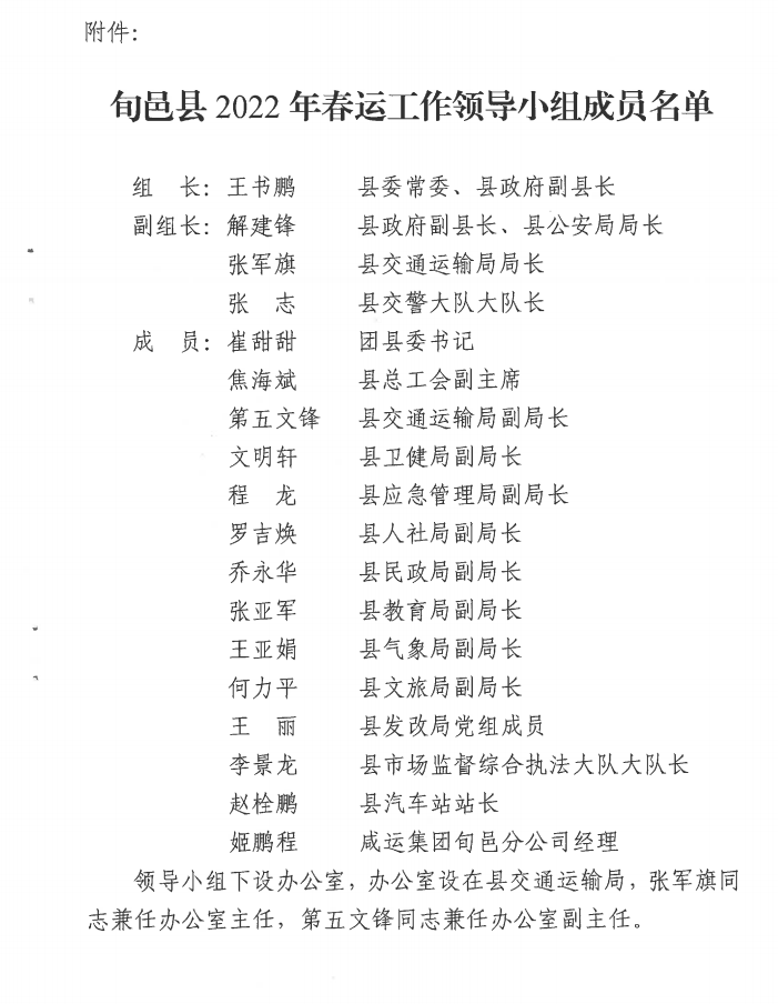 | 主题词 | 旬邑县 人民政府 政府办公室 关于做好 2022 春运工作 的通知 | ||
