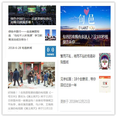 (三)全力发挥新媒体服务功能。“古豳旬邑”微信公众号全年发布信息1036条,订阅数21576。2018年成功开通“古豳听吧”栏目,策划了“绿色中国行 走进美丽旬邑公益晚会”、“守护旬邑蓝”、“《黄土高天》邂逅美丽旬邑”、“凝心聚力促发展——镇办系列报道”等专题。其中,“在旬邑取景拍摄的电视剧《一号文件》更名为《黄土高天》,明天就要在央视一套开播了”浏览量突破3.5万次。
